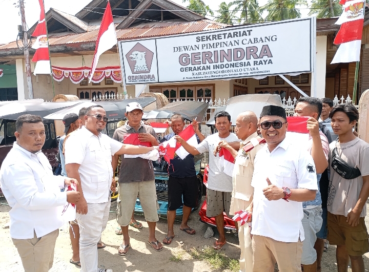 Publishare.id- Dalam rangka menyemarakkan peringatan HUT Kemerdekaan Republik Indonesia ke-80 tahun 2025, Partai Gerindra Gorontalo Utara (Gorut) menggelar aksi pembagian 1000 bendera Merah Putih kepada para pengemudi bentor dan pengguna jalan yang melintas di sekitar Kantor Partai Gerindra Gorut.