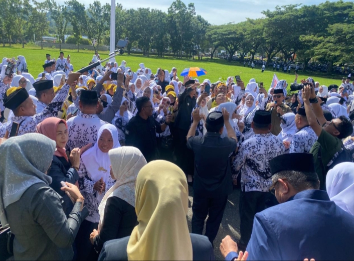 Para guru yang hadir terlihat antusias, beberapa bahkan ikut menyanyikan lagu tersebut sambil merekam momen itu. Penampilan ini menjadi salah satu agenda hiburan yang berhasil memeriahkan suasana setelah rangkaian upacara resmi berlangsung.