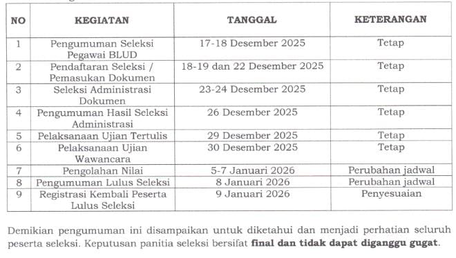 Sementara itu, untuk formasi selain dokter, panitia menetapkan jadwal baru, yaitu pengumuman kelulusan seleksi pada 5 hingga 7 Januari 2026, dilanjutkan dengan tahapan pengolahan nilai pada 8 Januari 2026, serta registrasi ulang peserta pada 9 Januari 2026.